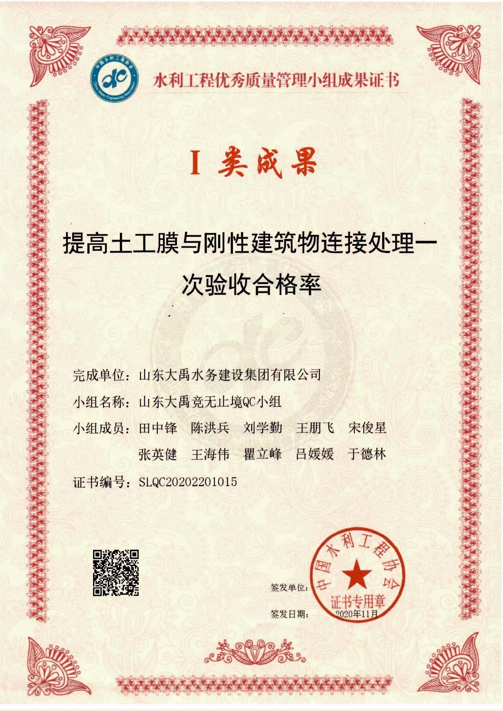2020年QC小組I類成果證書