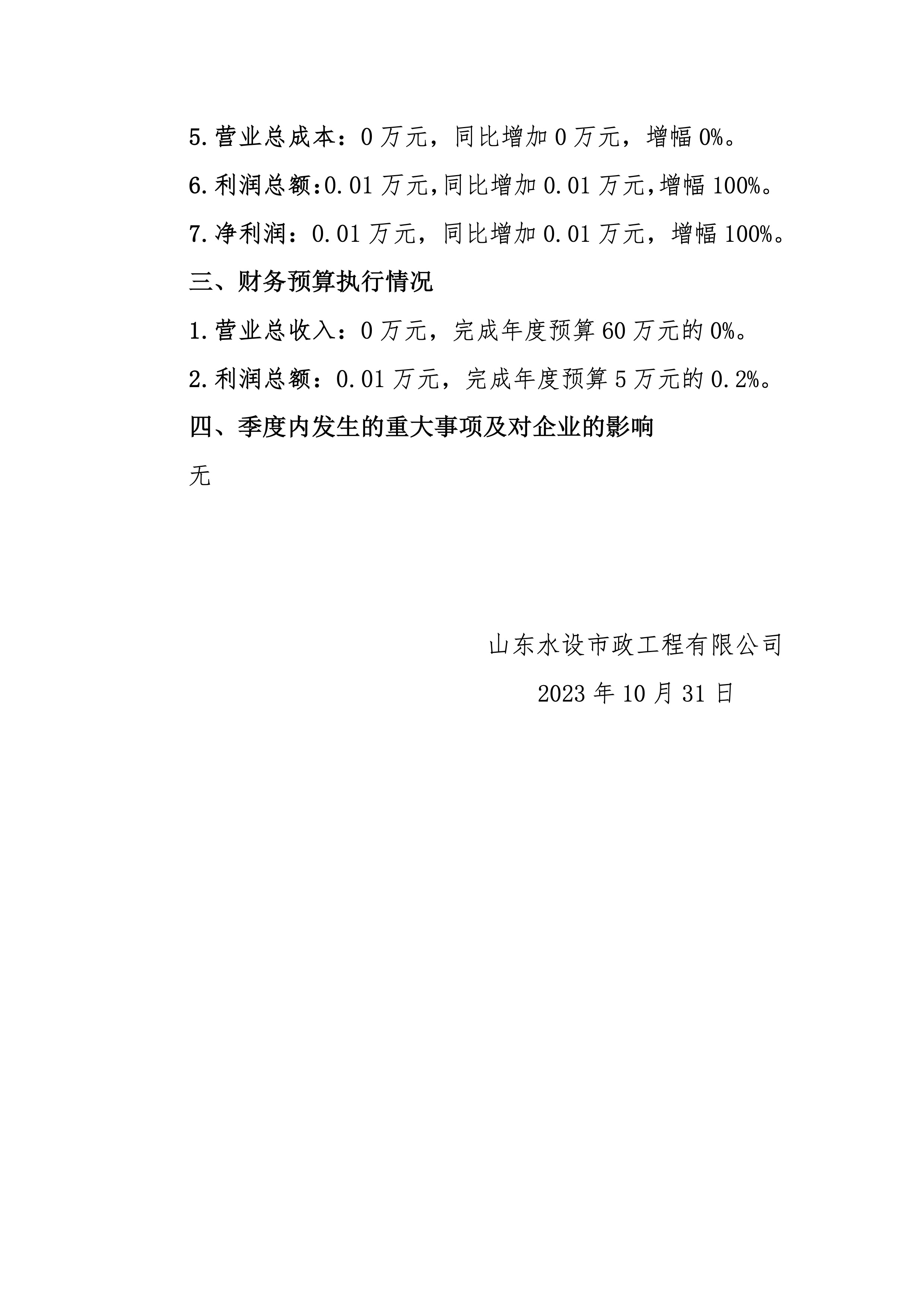 山東水設市政工程有限公司2023年第三季度財務信息公告