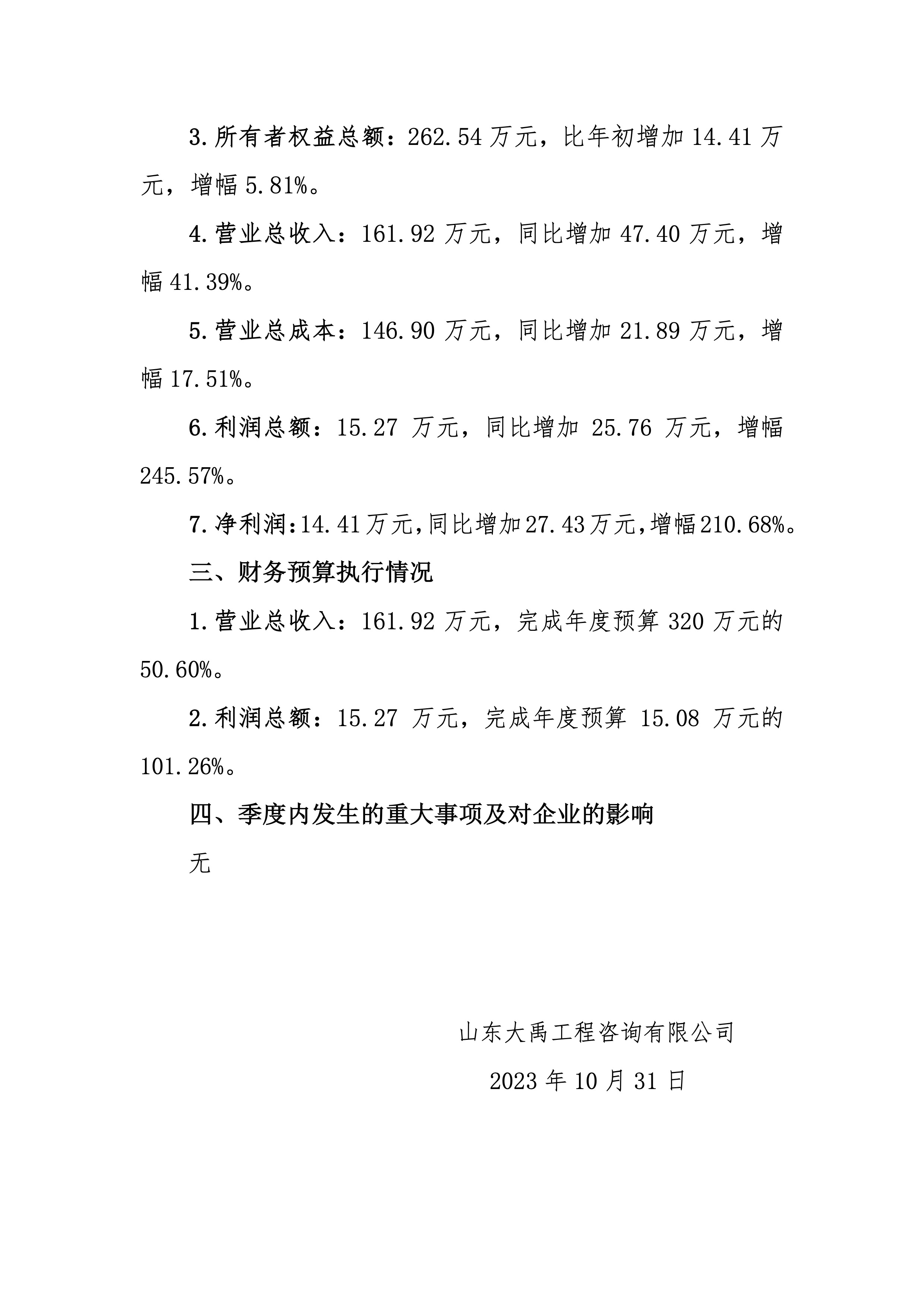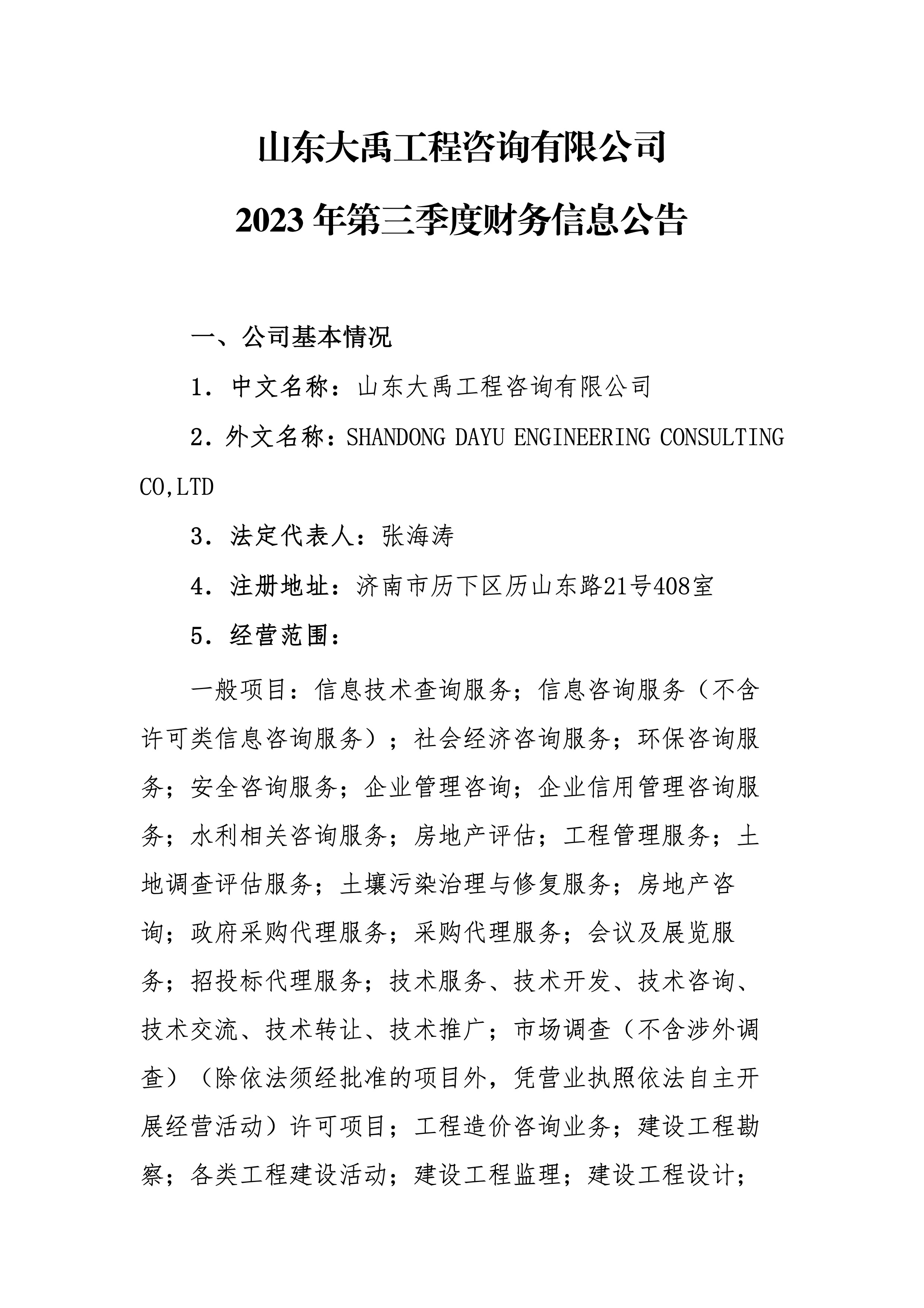 山東大禹工程咨詢有限公司2023年第三季度財務信息公告