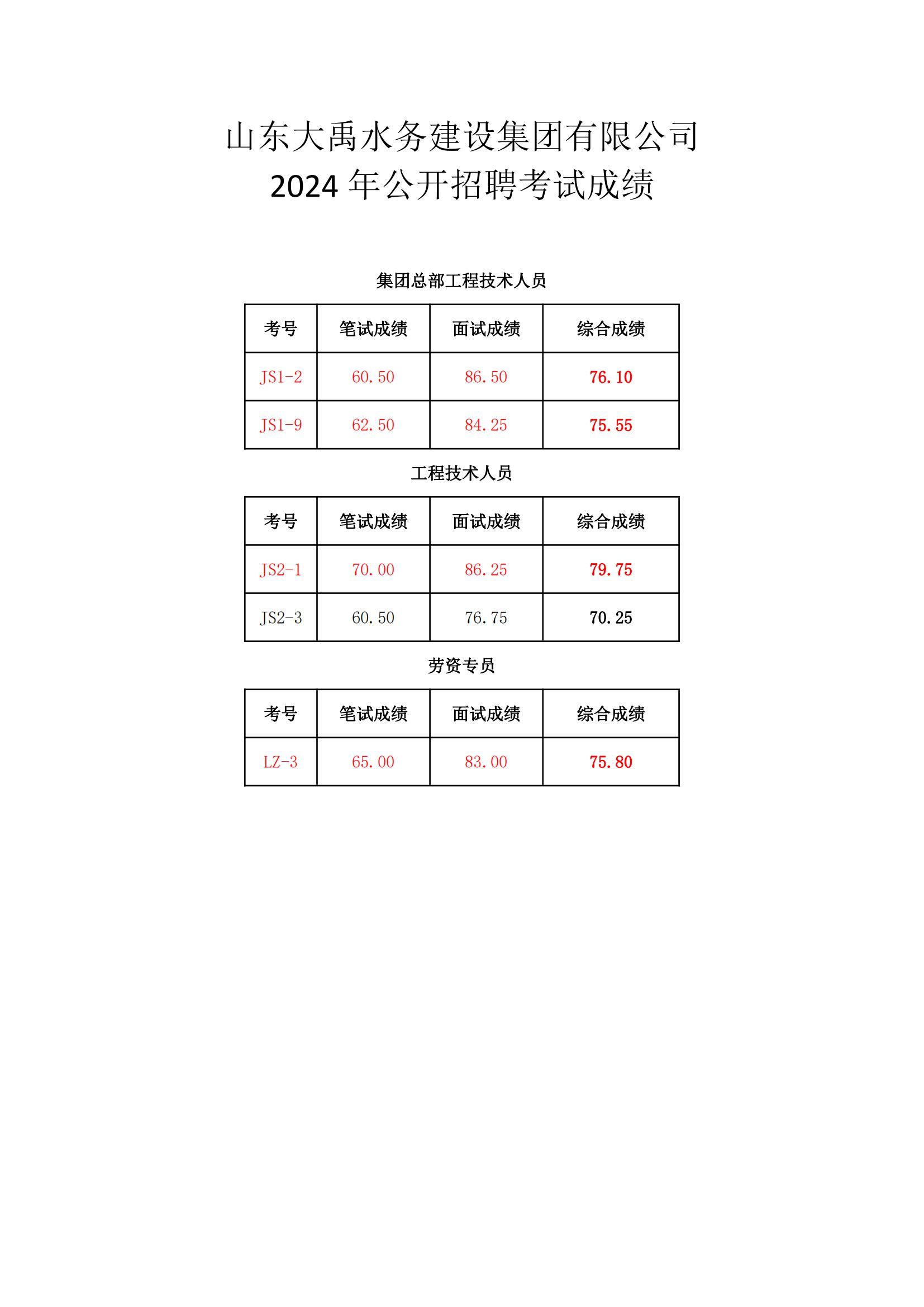 山東大禹水務建設集團有限公司2024年公開招聘考試成績公告