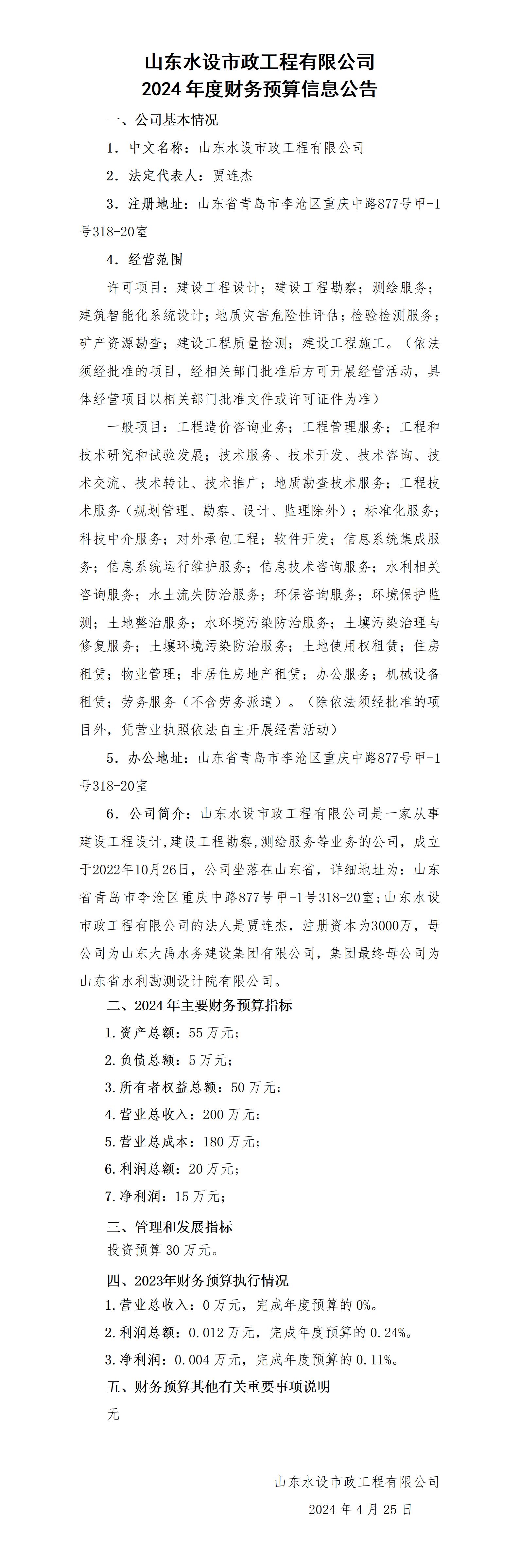 山東水設(shè)市政工程有限公司2024年度財(cái)務(wù)預(yù)算信息公告