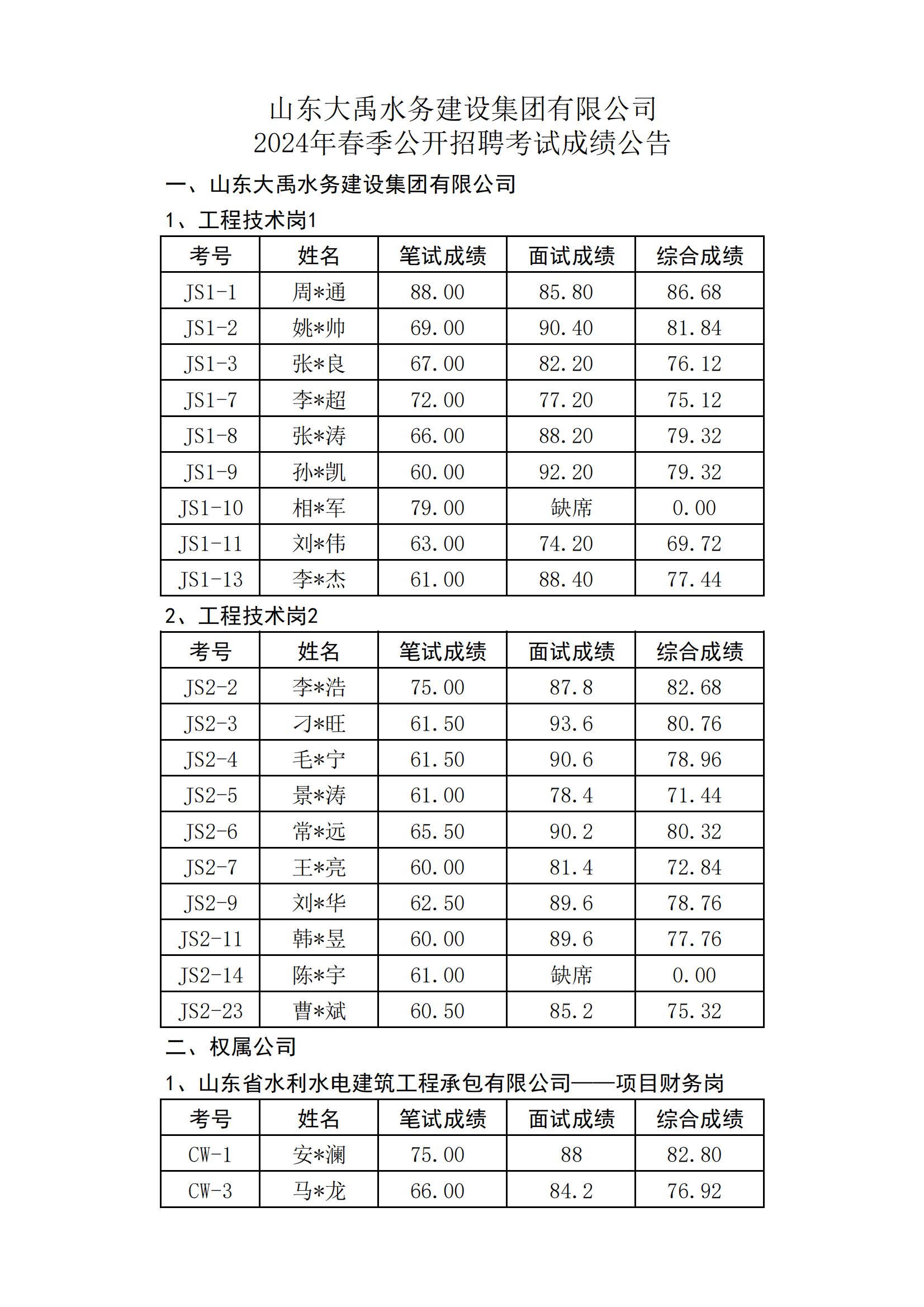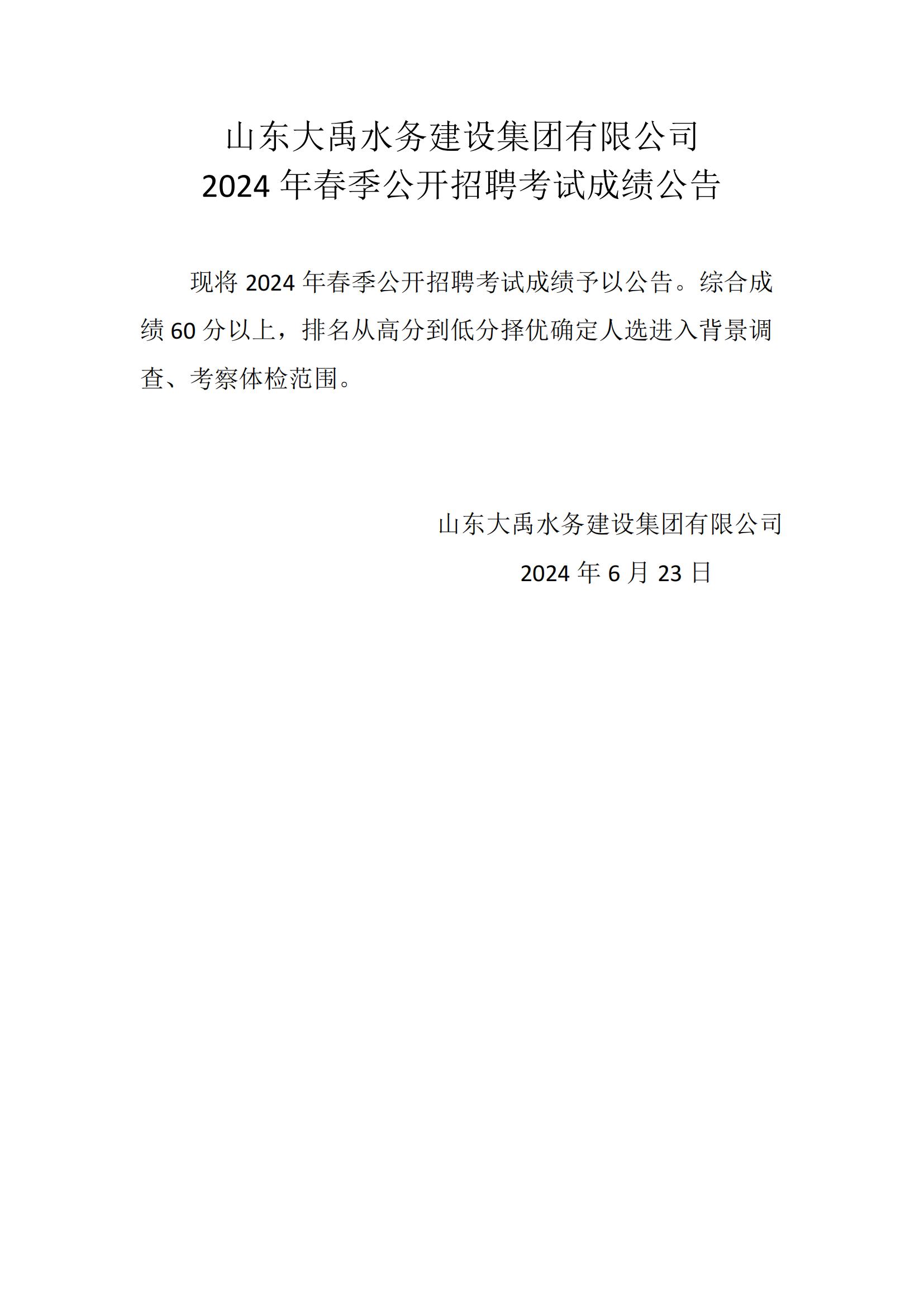 山東大禹水務建設集團有限公司2024年度春季公開招聘筆試成績公告