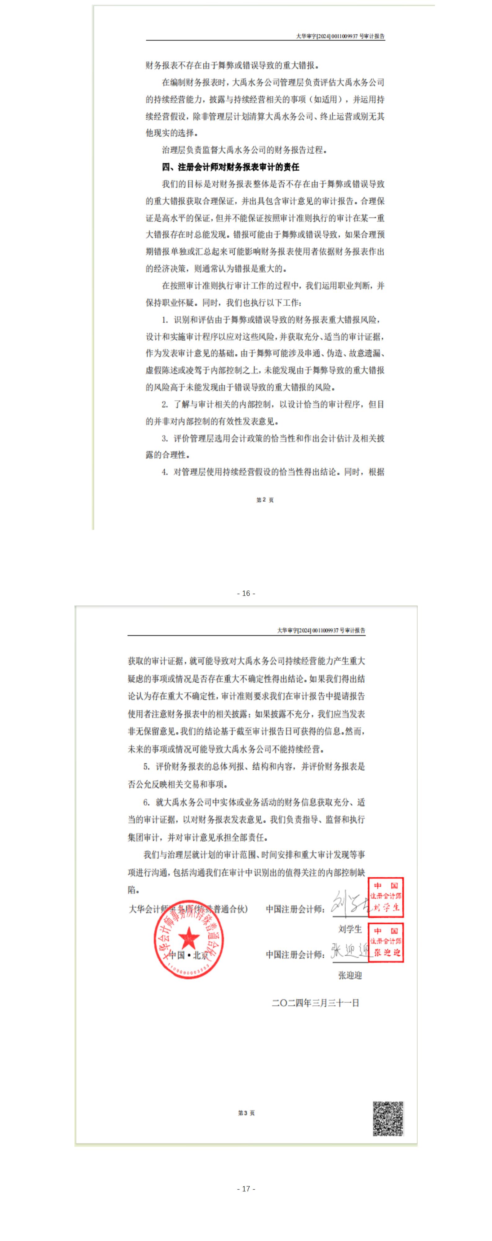山東大禹興水勞務有限公司2023年度財務重大信息公告