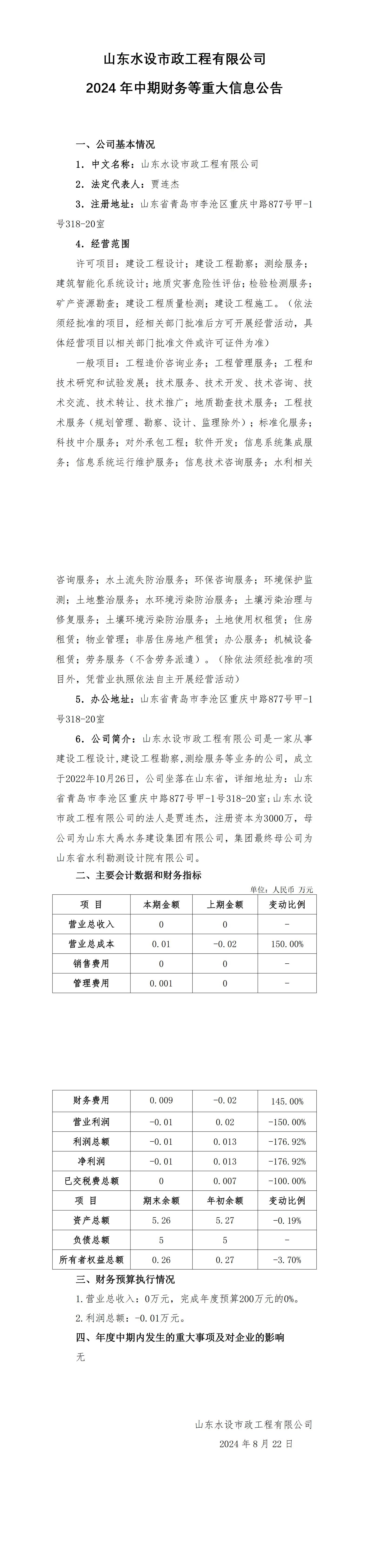 山東水設(shè)市政工程有限公司2024年中期財務(wù)等重大信息公告