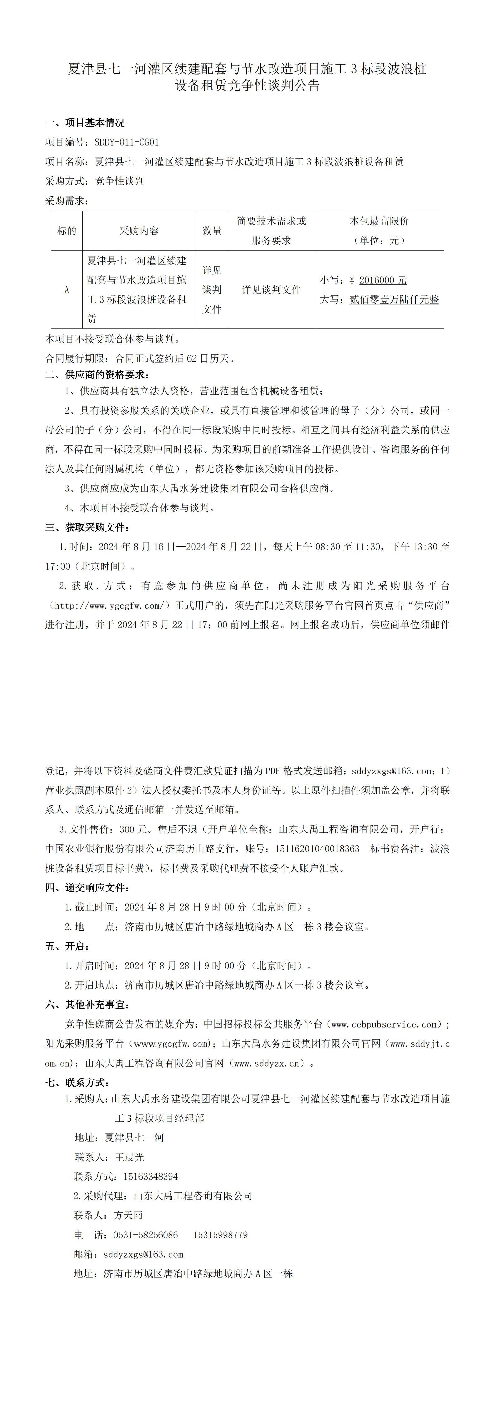 夏津縣七一河灌區續建配套與節水改造項目施工 3 標段波浪樁 設備租賃競爭性談判公告