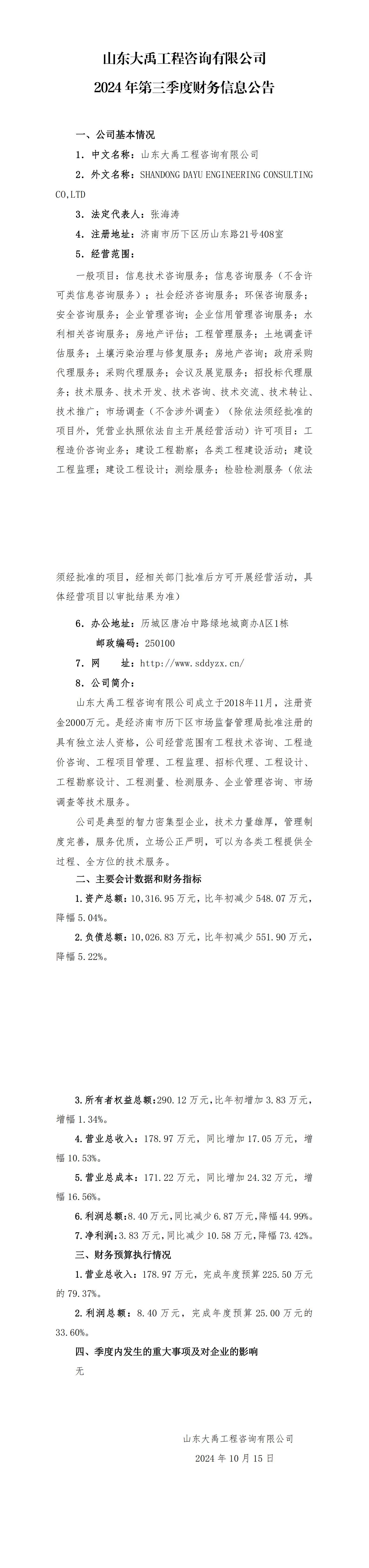 山東大禹工程咨詢有限公司2024年第三季度財(cái)務(wù)信息公告