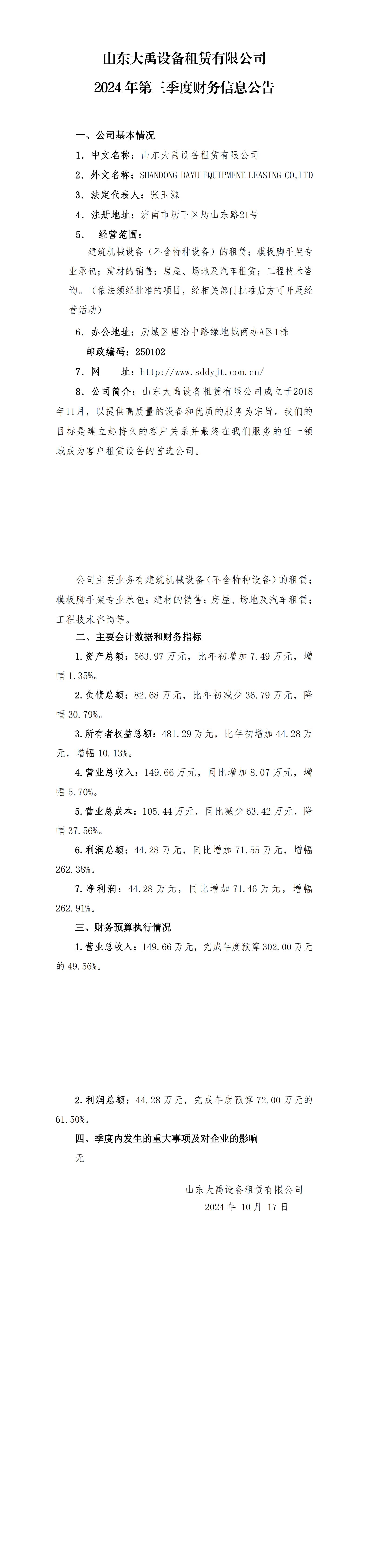 山東大禹設(shè)備租賃有限公司2024年第三季度財務(wù)信息公告