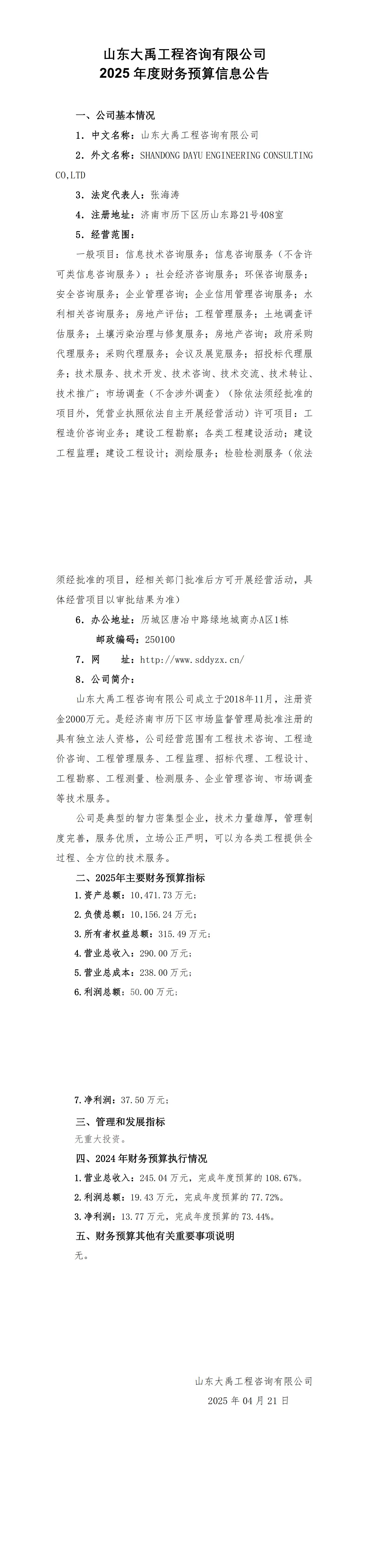 山東大禹工程咨詢有限公司2025年度財務預算信息公告