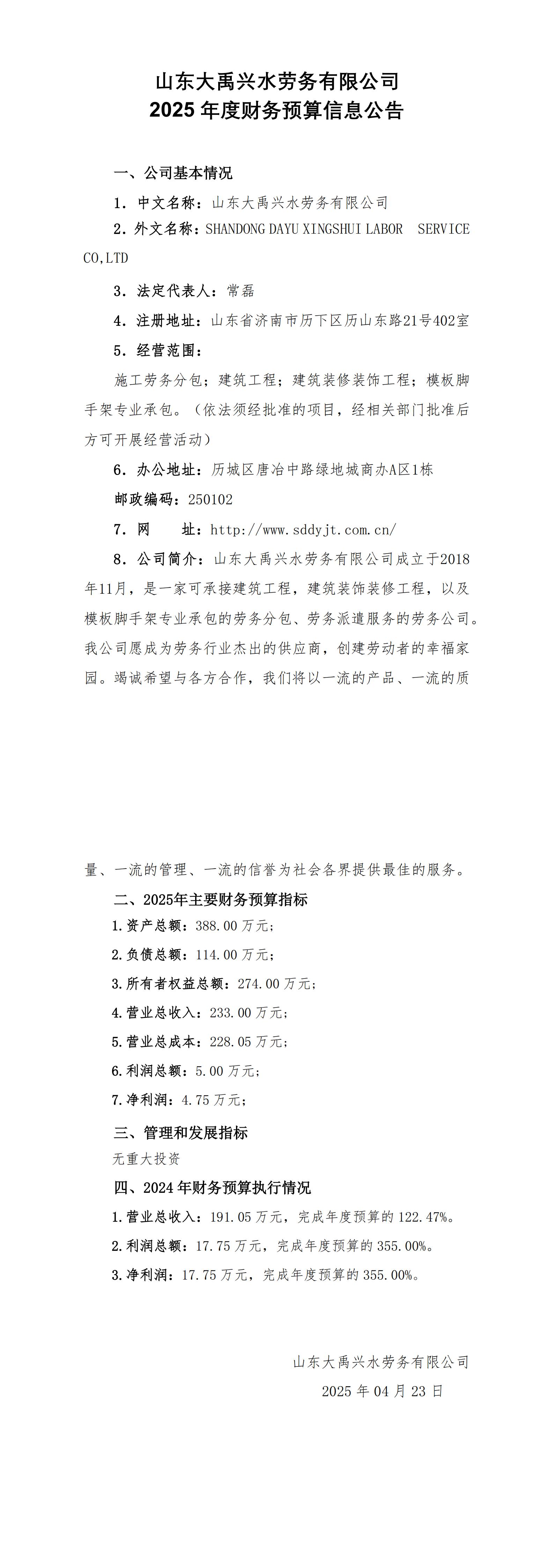山東大禹興水勞務(wù)有限公司2025年財(cái)務(wù)預(yù)算信息公告
