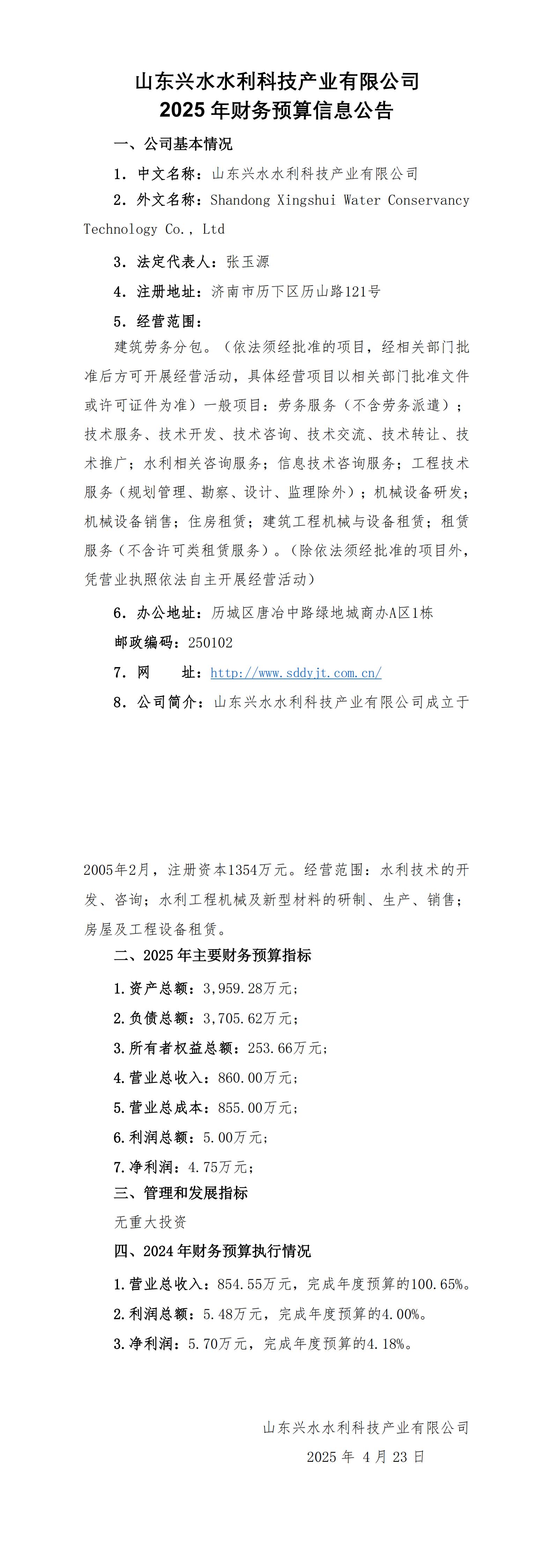山東興水水利科技產業有限公司2025年財務預算信息公告