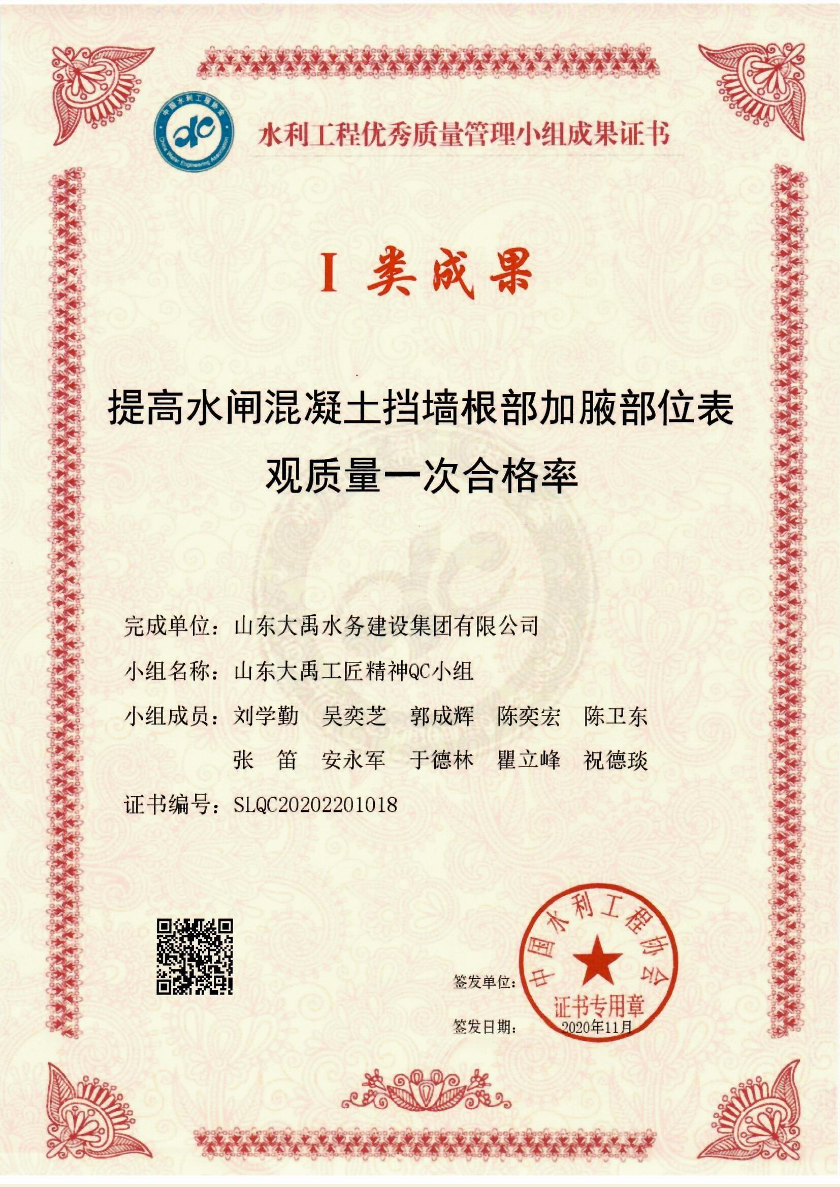 2020年QC小組I類成果證書